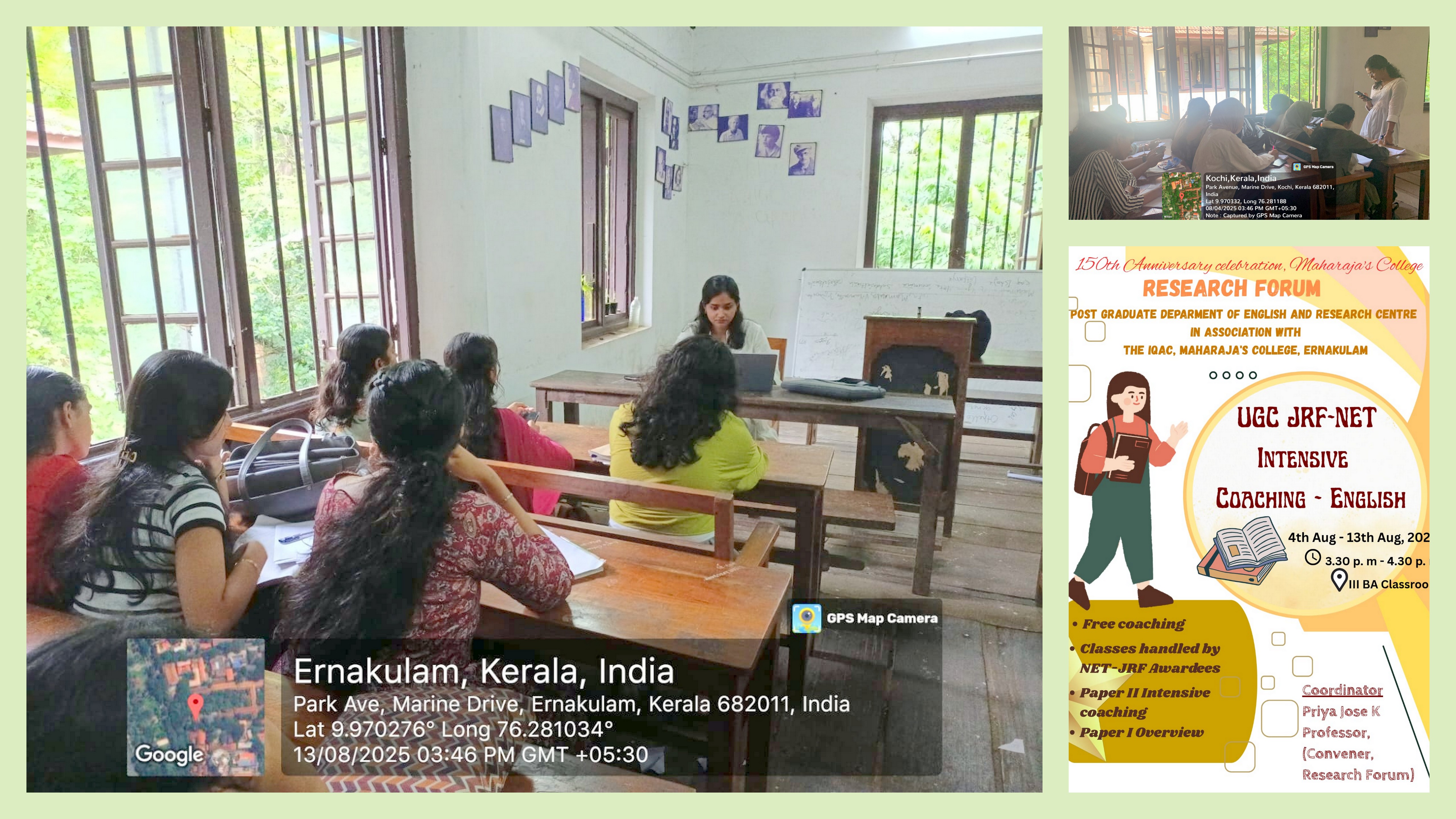 An Intensive UGC- NET&JRF coaching program was organised by the Research Forum of the Department of English, Maharaja's College, Ernakulam from 4th of August, 2025 to 13th August, 2025. The aim of the program was to provide students of the department effective guidance and orientation to successfully attempt the UGC NET and JRF exam thereby helping them in their academic careers. The free coaching classes were conducted bythe research scholars of the Department of English, Maharaja’s College who have cleared the UGC- NET&JRF examination. The sessions were conducted after class hours from 3:30pm to 4:30pm and were attended by students from the department. The first session of the program was held on 4th of August, 2025 by Ms. Maya Purushothaman. The speaker gave an intensive introduction to the UGC NET&JRF exam providing personal insights and practical solutions to tackle the syllabus and question papers. She provided a detailed breakdown of the first paper of the exam and gave a module wise analysis of previous year's questions. The second session was conducted by Ms.Anula on 5th August, 2025. She dealt with Victorian literature from the second paper of the exam and shared her insights and experiences on clearing the JRF exam with a special focus on paper 2. The third session of the program was conducted by Mr. Jimmy John on 6th of August, 2025. He gave a detailed introduction to the second paper of the exam providing the students with a detailed booklist for preparation. He also introduced various digital resources like online quizzes to aid the students in preparation. Strategies for time management and effective covering of syllabus was also discussed. The fourth session was conducted by Mr. Sharath on 7th of August, 2025. He shared his personal experiences and insights about clearing the JRF exam and elaborated on the techniques he used to prepare for the exam. His experiences helped the students to understand the importance of smart study and smart work in the preparation for competitive exams. The session also included a discussion of previous years’ question papers, with special emphasis on 19th-century British literature. The fifth session of the program was conducted on 8th August, 2025 by Dr. Priya Jose K., Professor and Research guide, Department of English, Maharaja's College. She held an extensive doubt clearing Q&A session in which students raised their queries regarding the benefits of NET and JRF in their academic careers. She also introduced the students to the nuances and possibilities of research in contemporary academia. The sixth session was conducted by Mrs. Joshila Catherine C.J. on 11th August, 2025. She discussed the first module of paper 2 titled Drama. She elaborated on the subtopics of the module such as Indian, American, British and other world dramas. The seventh session of the program was taken by Mr. Sharath on 12th August, 2025 as sequel to his first session. He conducted an interactive session including activities such as ‘Who am I?’ in which clues about celebrated authors or characters were given for students to guess their identity. The eighth and last session of the program was conducted by Ms. AmnaFathima on 13th August, 2025. She engaged the students in paper 2 and shared the strategies required to excel in the paper. She also cleared the doubts raised by the students on various aspects of the exam. The students attended all the classes with great enthusiasm and curiosity making the program a grand success. The program held with a mission mode focusing on generating employable, skilled and motivated academicians by imparting value addition to education is a testament to the 150 years of legacy of Maharaja's College which has a long tradition of stellar academicians like Professor M.K. Sanu.